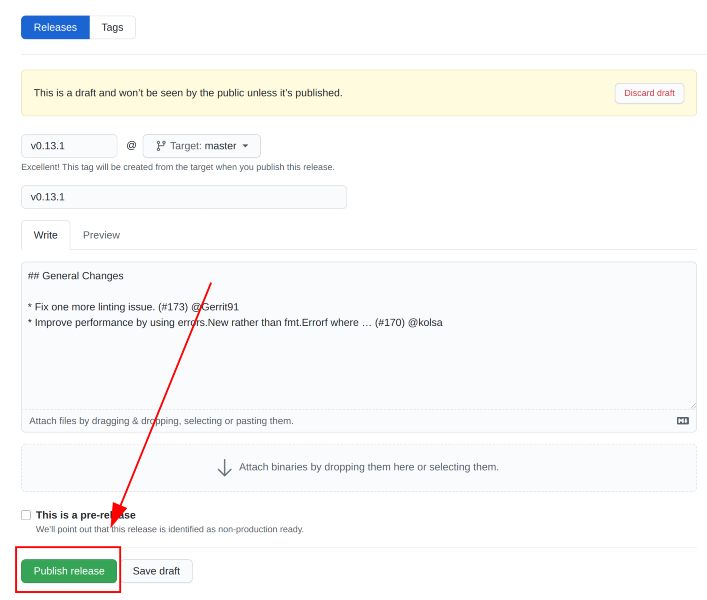 The draft is then used to create a project release. The release has to be published through the GitHub UI as demonstrated in the screenshot below.